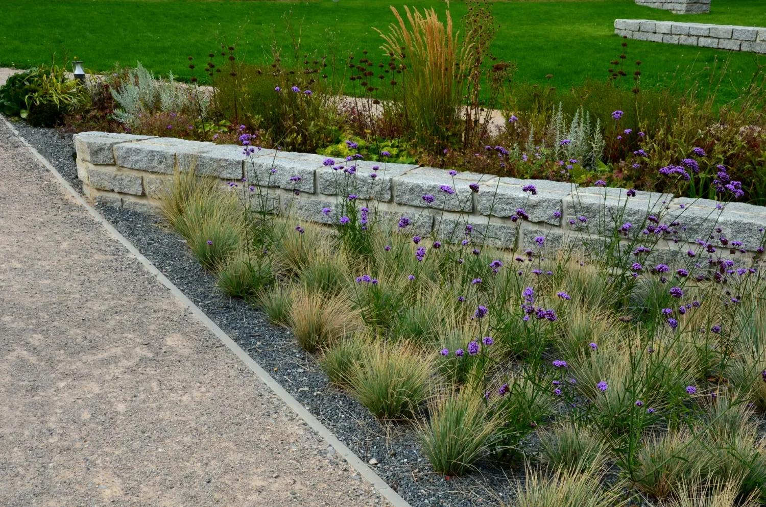 Low-profile walls that guide traffic flow and frame planting beds